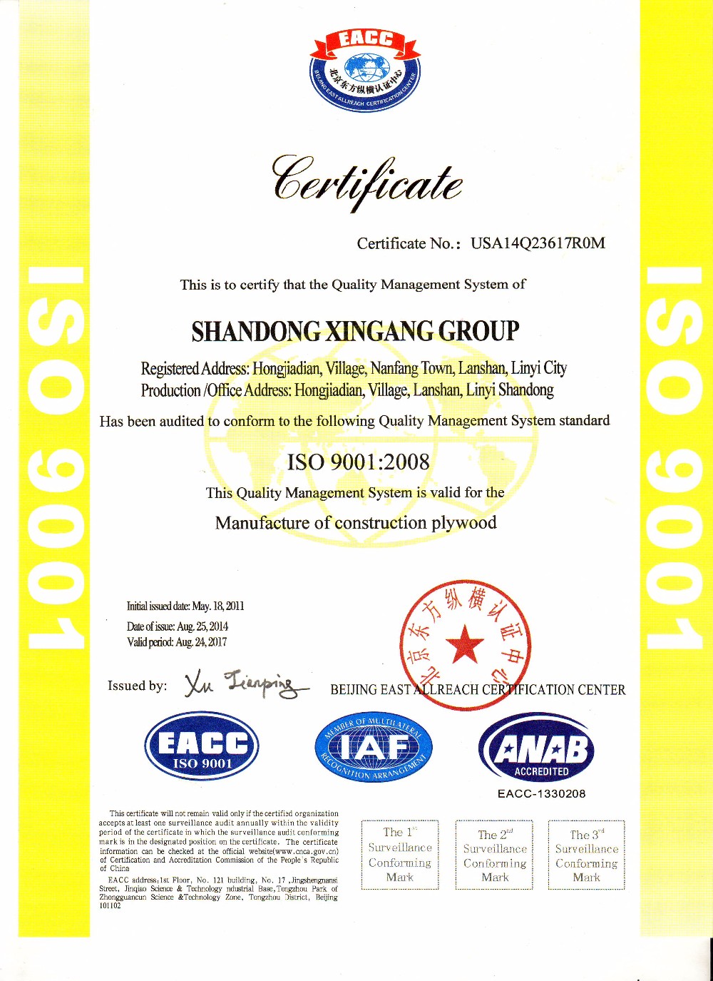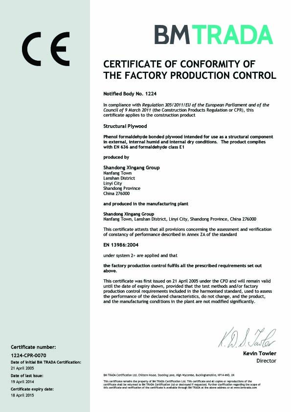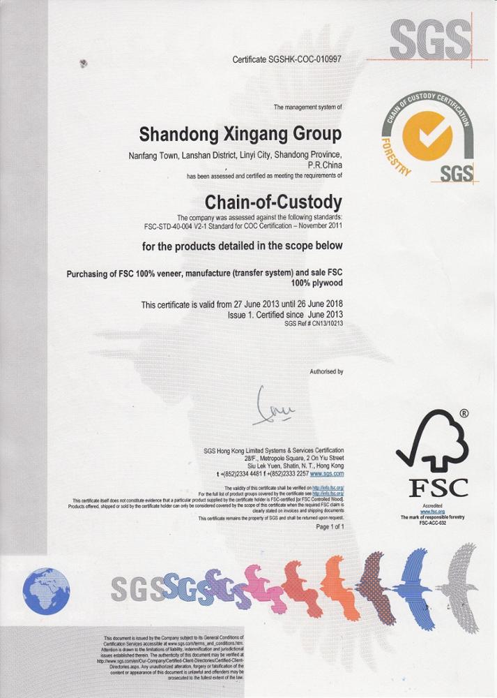 山東新港グループは、中国で最大のフィルム合板および関連製品のメーカーであり、1993 年に設立され、9 つの子会社と 3000 人以上の従業員、150 セットの世界クラスの生産設備を擁し、年間生産量は 300,000 CBM です。 .製品はISO9001:2000、ISO14001:2004、CE、FSC、BFUの認証を受けており、100カ国以上に販売されています。